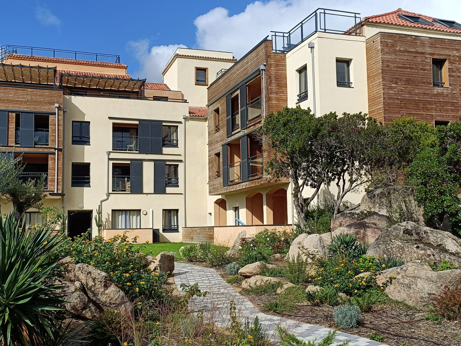 Le logement est un T2 exposé Nord-Est en rez-de-jardin avec une vue sur le maquis. Une grande terrasse couverte vous permettra de profiter pleinement des repas pris en plein air.